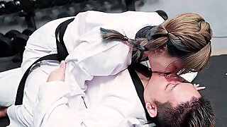 Karate babe Bad Bad rides cock and gets creampie